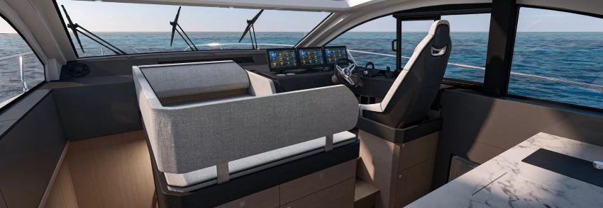 Sự liên kết thẩm mỹ giữa hai sản phẩm tiếp tục được nhấn mạnh trong khoang lái, nơi Beneteau sử dụng vô lăng thiết kế theo phong cách xe thể thao, cùng loạt chi tiết hoàn thiện theo cảm hứng sợi carbon thường thấy trên các mẫu Alpine hiệu suất cao. Alpine cho biết phiên bản du thuyền đặc biệt này sử dụng nhiều vật liệu và giải pháp thiết kế từ ngành ô tô, tạo nên 300 chi tiết chế tạo riêng cho môi trường hàng hải.