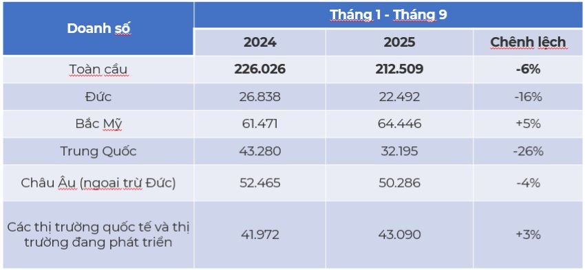 Bất chấp môi trường kinh doanh đầy biến động, Porsche vẫn duy trì đà tăng trưởng doanh số trong 9 tháng đầu năm 2025. Hãng xe thể thao Đức đã bàn giao tổng cộng 212.509 xe tới khách hàng toàn cầu, với tỷ lệ xe điện hóa đạt 35,2%, tăng mạnh 12,8% so với cùng kỳ năm ngoái. Trong đó, xe thuần điện chiếm 23,1%, còn hybrid sạc điện chiếm 12,1%.