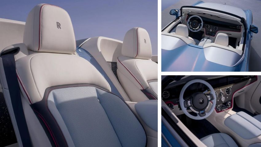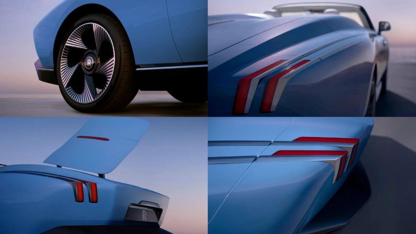 Dọc thân xe là hai dải thép không gỉ chạy từ đầu đến đuôi, liên kết với cụm đèn hậu LED dạng đôi mảnh, tạo hiệu ứng thị giác như những vết cắt sắc lẹm. Phía sau, thiết kế “Piano Boot” cho phép khoang hành lý mở ngang như nắp đàn piano, chi tiết mang tính nghệ thuật cao. Bộ mâm kích thước 24 inch lớn nhất từng xuất hiện trên một mẫu Rolls-Royce đi cùng lớp sơn Côte d’Azur Blue pha ánh đỏ, gợi nhớ màu sắc của chiếc 17EX năm 1928.