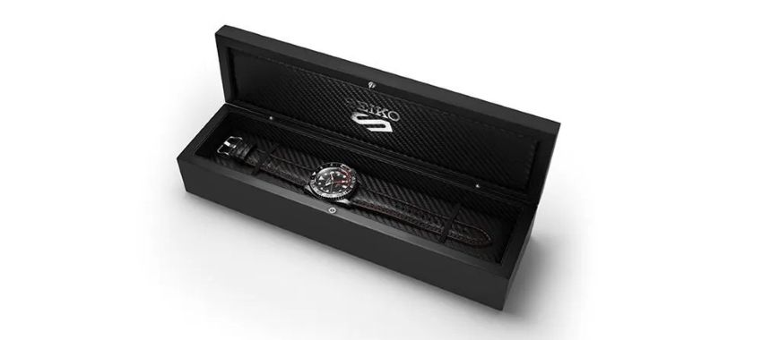 Về thiết kế, đồng hồ sở hữu vỏ thép không gỉ, khả năng chống nước 100 m cùng mặt kính Hardlex. Mặt số được hoàn thiện với họa tiết vân carbon, đi kèm các chi tiết nhấn màu đỏ nhằm tăng tính nhận diện theo phong cách thể thao. Dây đeo da màu đen cũng được tạo hình tương đồng với họa tiết carbon, kết hợp lớp lót đỏ và đường chỉ khâu tương phản.