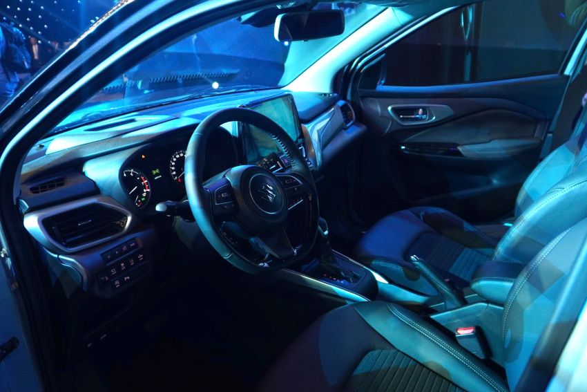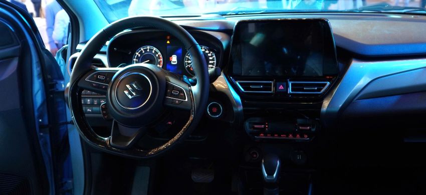 Tuân thủ triết lý thiết kế toàn cầu “Sho-Sho-Kei-Tan-Bi” (Nhỏ – Gọn – Nhẹ – Ngắn – Đẹp), Fronx giữ được tỷ lệ cân đối, gọn gàng nhưng vẫn đảm bảo không gian nội thất rộng rãi với chiều dài cơ sở 2.520 mm, vượt trội trong phân khúc. Khoang lái của Fronx được kết hợp tông màu đen – đỏ bordeaux tạo chiều sâu và nét sang trọng, trong khi các chi tiết ốp kim loại, chất liệu da pha nỉ và da tổng hợp ở bảng cửa được hoàn thiện tinh xảo, tinh tế và hiện đại. Trung tâm bảng táp-lô là màn hình giải trí 9 inch hỗ trợ Apple CarPlay® và Android Auto™ không dây, kết hợp màn hình hiển thị trên kính lái (HUD), camera 360 độ, cùng sạc điện thoại không dây.