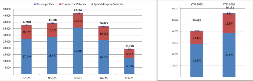 Cụ thể, tổng doanh số bán hàng toàn thị trường ô tô trong tháng 2/2026 đạt 19.278 xe, giảm 48% so với tháng 1/2026 và giảm 10,8% so với cùng kỳ tháng 2/2025. Trong tổng số xe bán ra, xe du lịch tiếp tục chiếm tỷ trọng lớn nhất với 12.376 xe. Phân khúc xe thương mại đạt 6.542 xe, trong khi xe chuyên dụng đạt 360 xe.